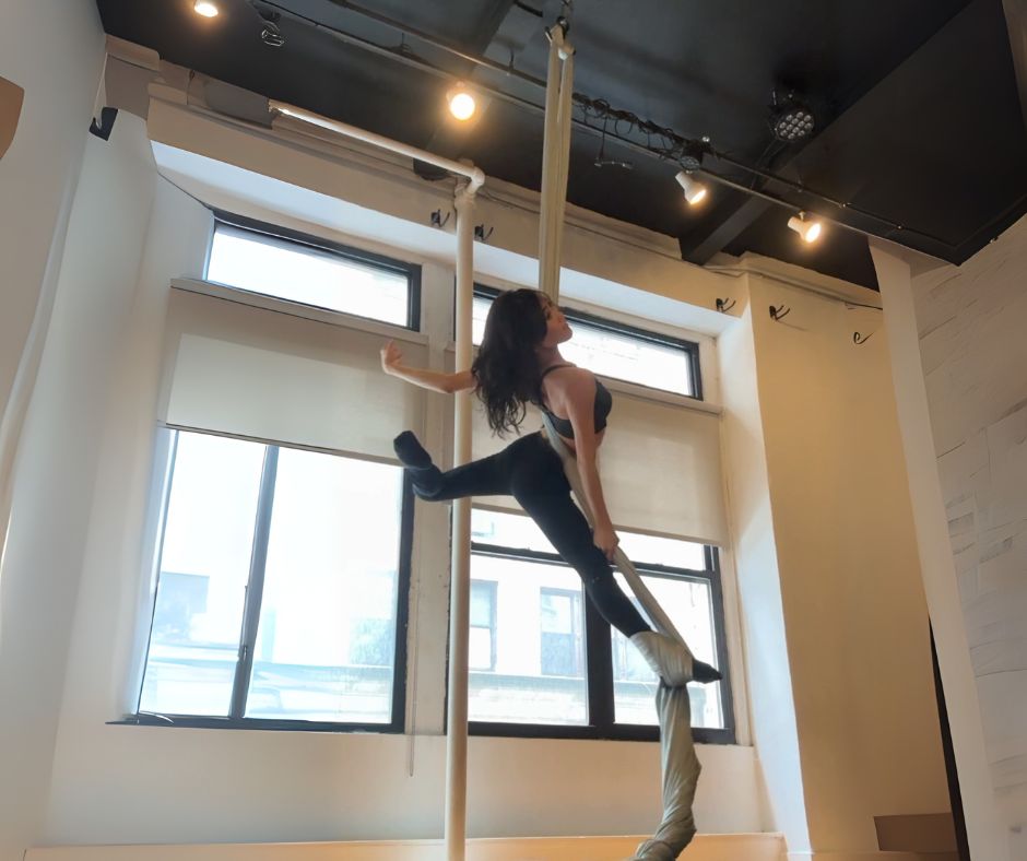 Holly started Aerial Silks Dancing last summer to expand upon her experiences in the air beyond Theatre Arts. She takes silks group classes in mid-town Manhattan and has a lot of friends who also do aerial dances. She finds it the hardest thing she has tried, requiring more strength and especially spatial awareness. In silks dancing, she must be aware of where her balance is at all times. Silks studios need high ceilings and a lot of space to teach. It is a dangerous sport, and studios put thick mats on the floor in case someone falls when doing their silks tricks. Holly wears long sleeves and leggings to prevent the silk from cutting into her skin. Most professional silks dancers have a lot of bruises due to their performance outfits.