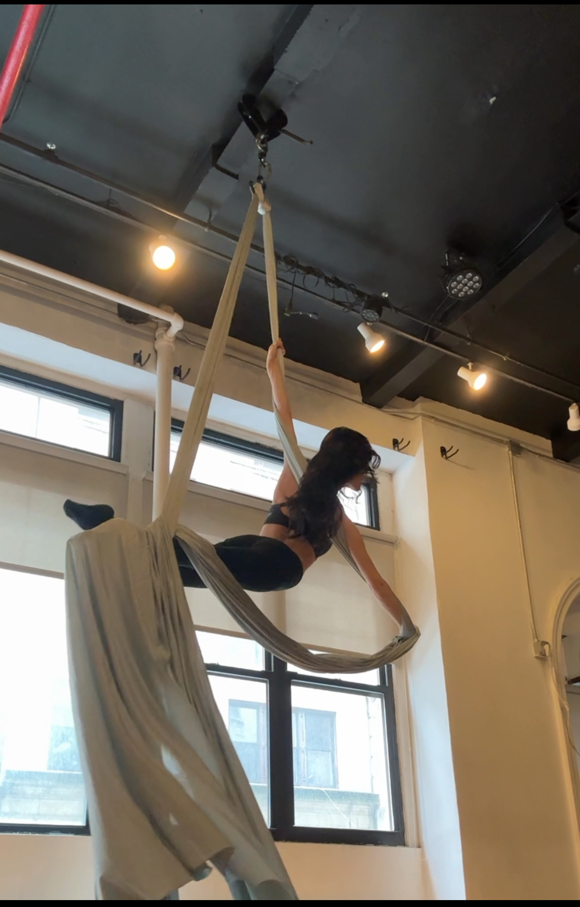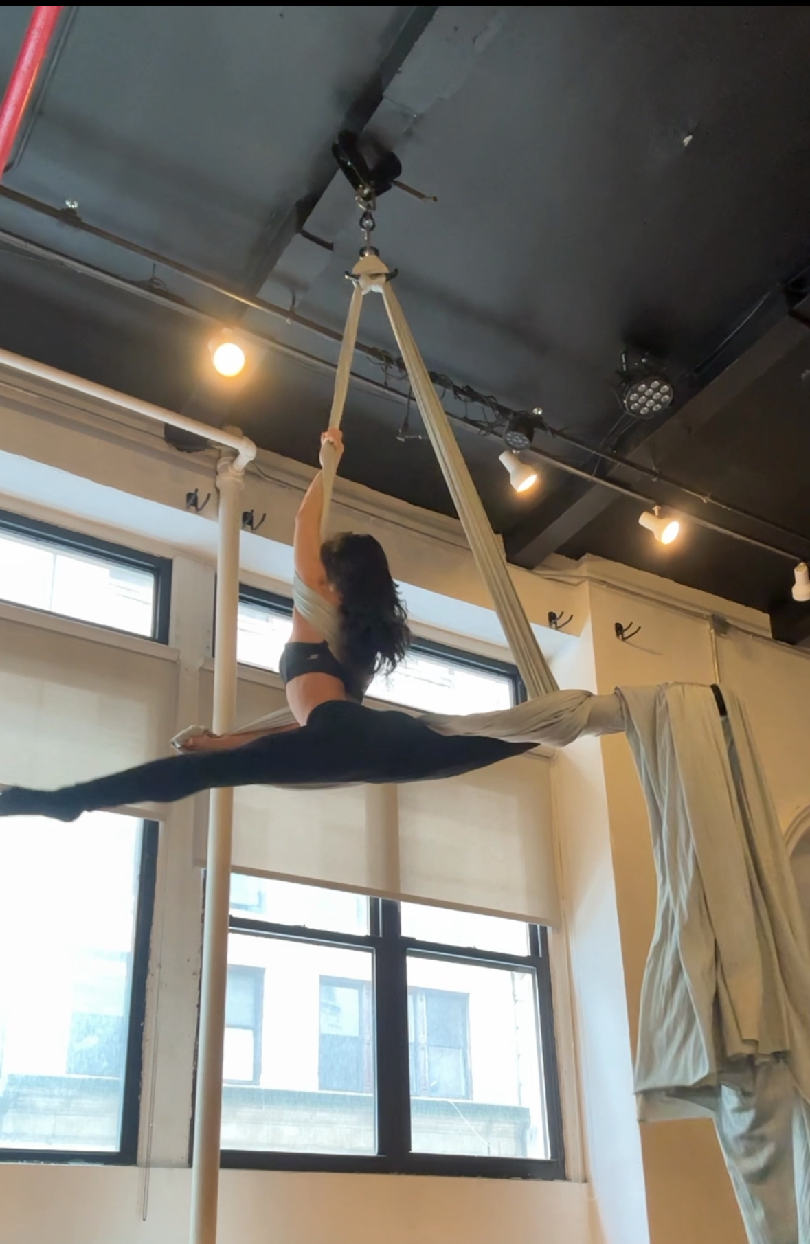 There are showcases in silks dancing. She has not thought about doing it yet, but will consider it for the future. For now, she enjoys the alone time in the air. There are other aerial categories, but she likes silks because she is a tactile dancer and likes working with the softness of silk.