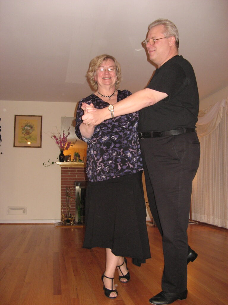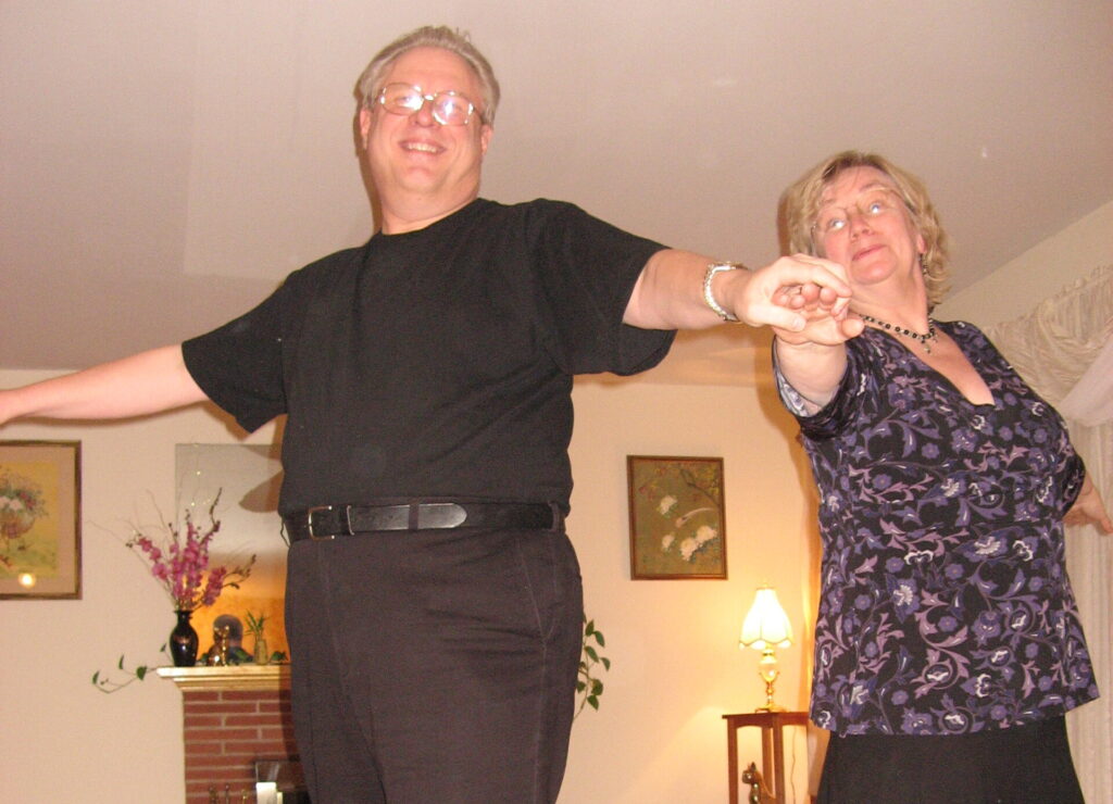 Anyway, back to the Swing. This was the first non-progressive dance we learned. No traveling. No walls. No posts. No traffic. Open stance, meaning no frame. Actually, there is this thing called compression, but for a new dancer, I didn’t worry about that. No frame – yippee! No steering! No hours trying to go in a straight line! No praying! And then the first dance miracle happened. I raised my arm, and my wife went under it and did a turn. It was amazing. What I had intended her to do – she did! I couldn’t believe it. All those moments with the Two Step and Country Waltz, where I’d lead and nothing would happen, just faded away. I raised my arm a second time. She did it again! Cause and effect. Holy cow, it works! A third time. A fourth. This is just amazing. “Enough,” she cried, “I’m dizzy.” That’s when I discovered the second advantage of the frame – you can hold your partner up. So my wife is staggering around, and I’m trying to steady her. I don’t know the name of that pattern, but we do it a lot. For the first time, I was beginning to enjoy dancing.