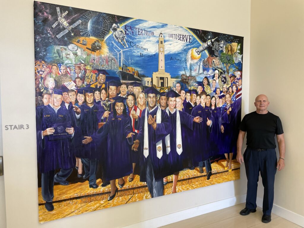 But what makes him the subject of this article is his art, several examples of which are included here. Despite having no formal art training, Jack was always an artist, and he developed his interest in art into a good side business. He estimates that he has created hundreds of pieces, small and large, and has become especially known for large commemorative murals. Having been an athlete, he gravitated towards sports art. He did murals for organizations and schools to celebrate milestones in their histories. His clients have included the military, universities, hospitals, law enforcement organizations, college sports, and professional sports teams. Prints of his paintings have been sold as fundraisers. Several buildings at LSU have his paintings of portraits of the people for whom buildings were named, and he has painted portraits of each of the All-American football players in the school’s history. At one point, the State Archives of Louisiana did a month-long exhibition of his work.