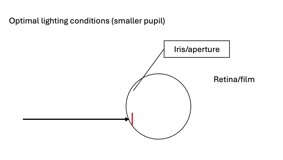 With a larger pupil (larger aperture) in poor lighting conditions, unfocused light is entering the eye. This causes decreased visual quality and difficulties with depth perception. Consequently, it can cause eye strain, balance issues, and an increase in visual glare. If a person has other underlying eye conditions, such as cataracts, this can exacerbate these conditions and cause a significant decrease in vision. Optimal lighting causes the pupil to be smaller, stopping defocused and unnecessary light from entering the eye. This improves image clarity, contrast, and depth perception.