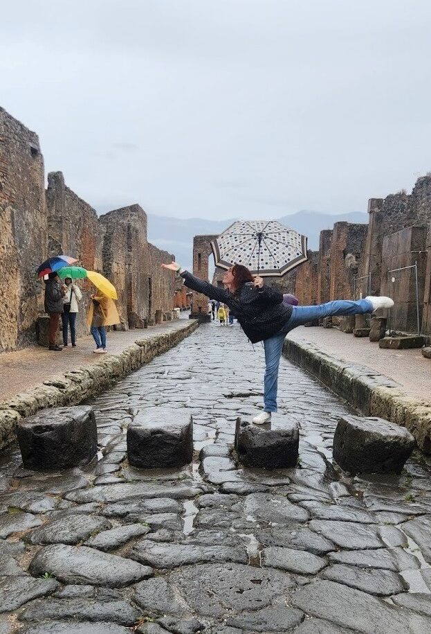 You haven’t truly tested your center until you’ve navigated the rain-slicked, 2,000-year-old cobblestones of Pompeii. Without Bryan there to help me maintain my frame (and I know, I know, we’re all supposed to be perfectly independent pillars of stability), my core had to do all the heavy lifting. I spent the afternoon dodging puddles and slick stones, and every step was a drill in stability and weight transfer. If you can maintain your poise and stay over your feet while navigating ancient chariot ruts and uneven Roman blocks, then a polished ballroom floor back home feels as reliable as a brand-new pair of Italian leather shoes!